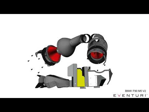 Het Eventuri inlaatsysteem voor M8 is ontwikkeld door middel van uitgebreide praktijktesten en air flow simulatieanalyse. Het bijgewerkte V2-design, heeft afgedichte filterbehuizingen om een stabielere IAT te behouden, zelfs bij stilstand. De grote luchtinlaten aan de voorzijde brengen de omgevingslucht rechtstreeks naar het intake gebied, waardoor de motor geen last heeft van hitte. Bovendien heeft Eventuri goudkleurige warmte reflecterend gevoerde schilden geïntegreerde stroomgeleiders die de omgevingslucht van de scoops in de filters leiden. Ze zijn er ook in geslaagd om de dwarsdoorsnede van de inlaatbuis met meer dan 30% te vergroten in vergelijking met de standaard intake terwijl deze door de openingen in wordt gevoerd. Hierdoor kunnen de turbo's meer werken met minder beperkingen en worden de waste-gate duty cycli verkort.