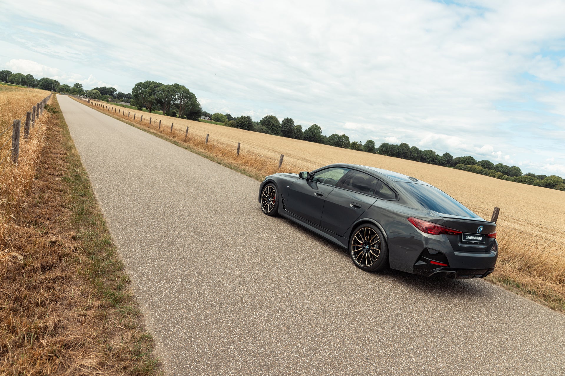 Door de spacers komen de velgen meer naar buiten wat een brutale uitstraling geeft aan de BMW. Op deze BMW i4 Gran Coupé zijn 15MM spacers gemonteerd.
