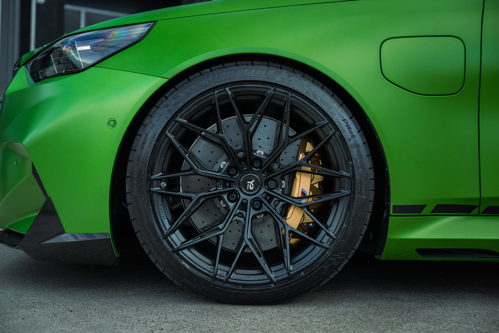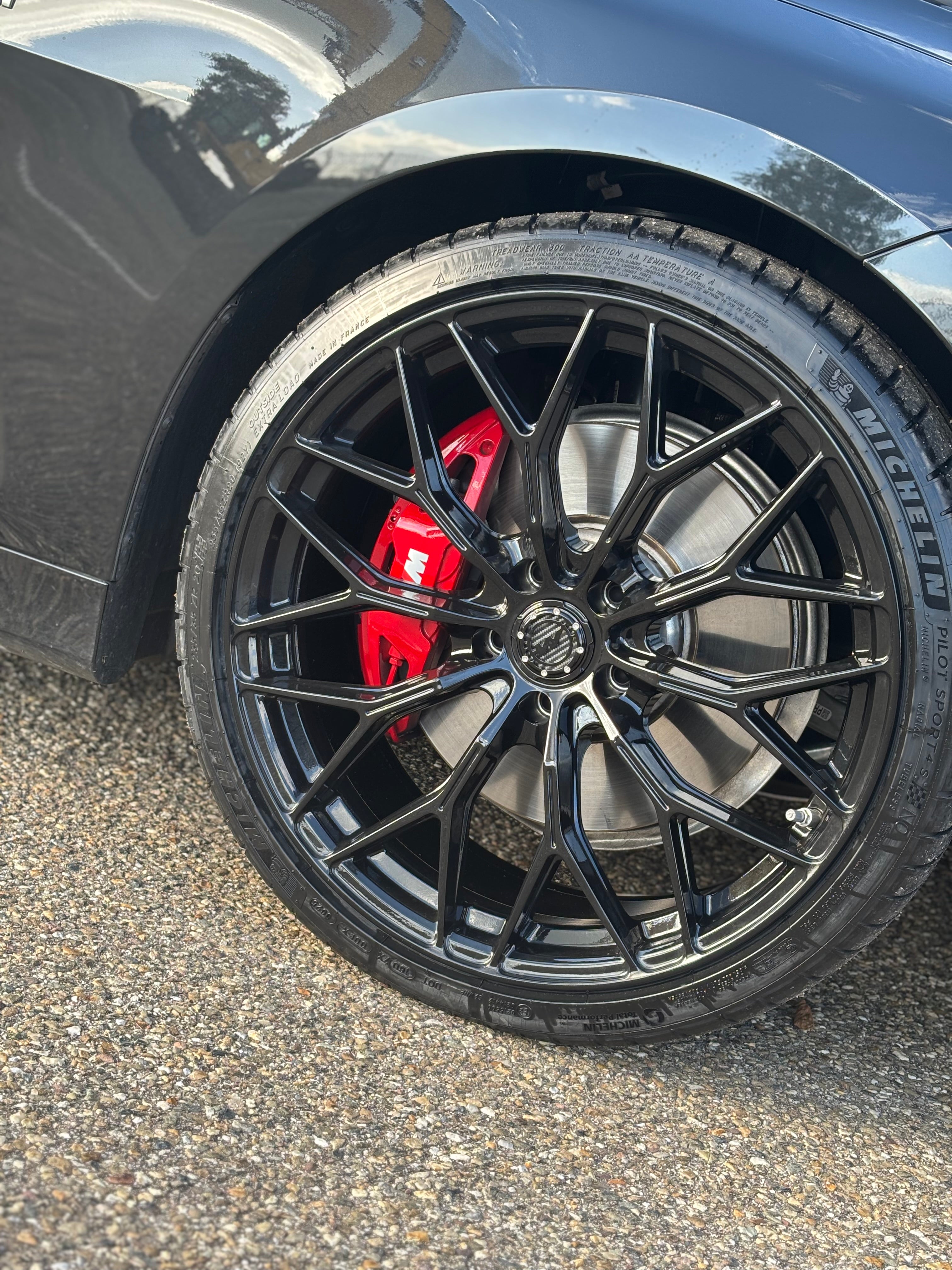 De wielset is een combinatie van Michelin Pilot Sport banden met Motech Performance M-WX 20'' Precision Black velgen.