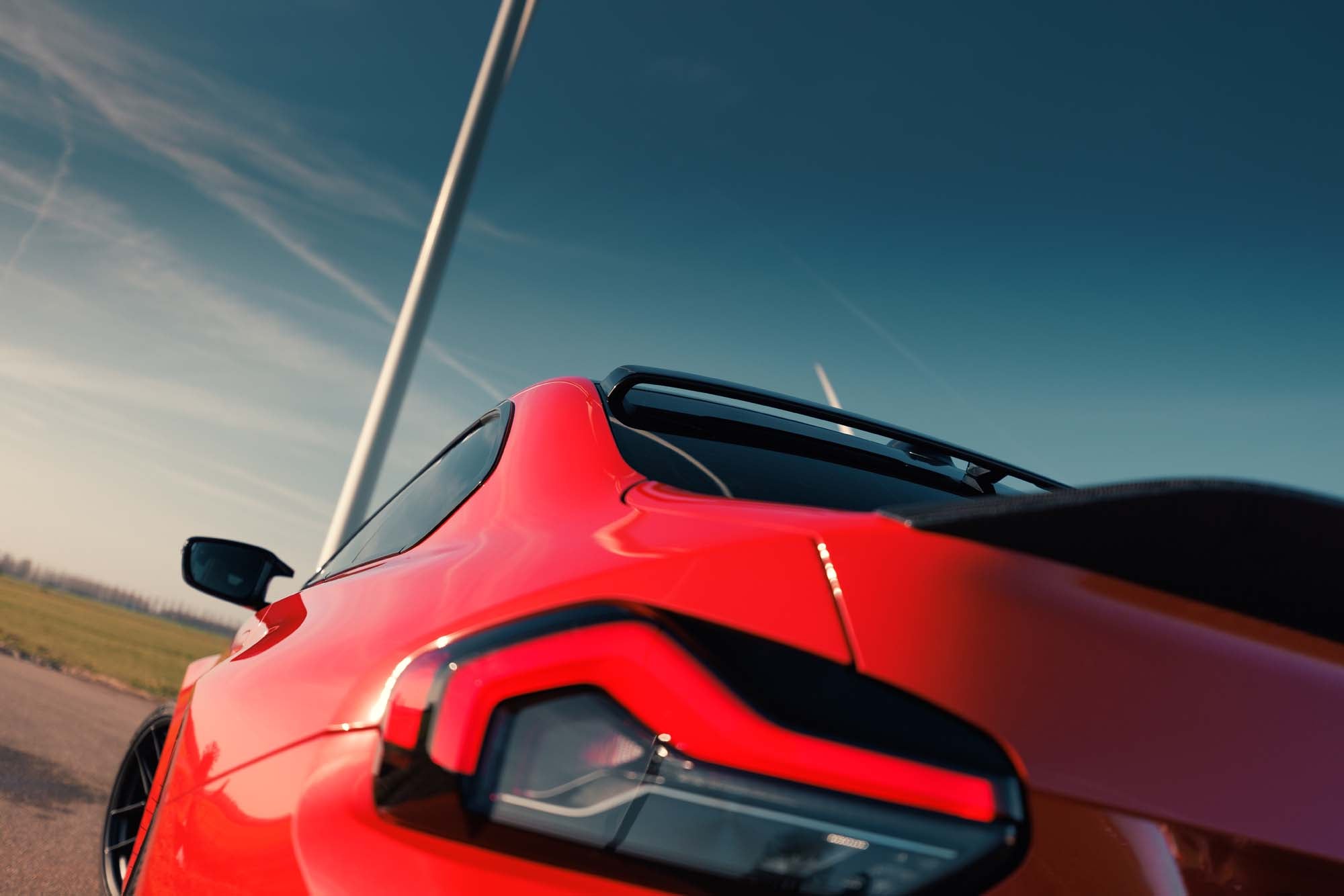De carbon achterklepspoiler accentueert de krachtige achterkant van de BMW M2 in Toronto Red. Subtiel maar functioneel, zorgt hij voor extra downforce bij hogere snelheden. Het zichtbare carbon geeft een high-performance uitstraling die perfect past bij het karakter van de auto. In combinatie met de andere carbon accenten vormt hij de finishing touch van een compromisloos sportief design.