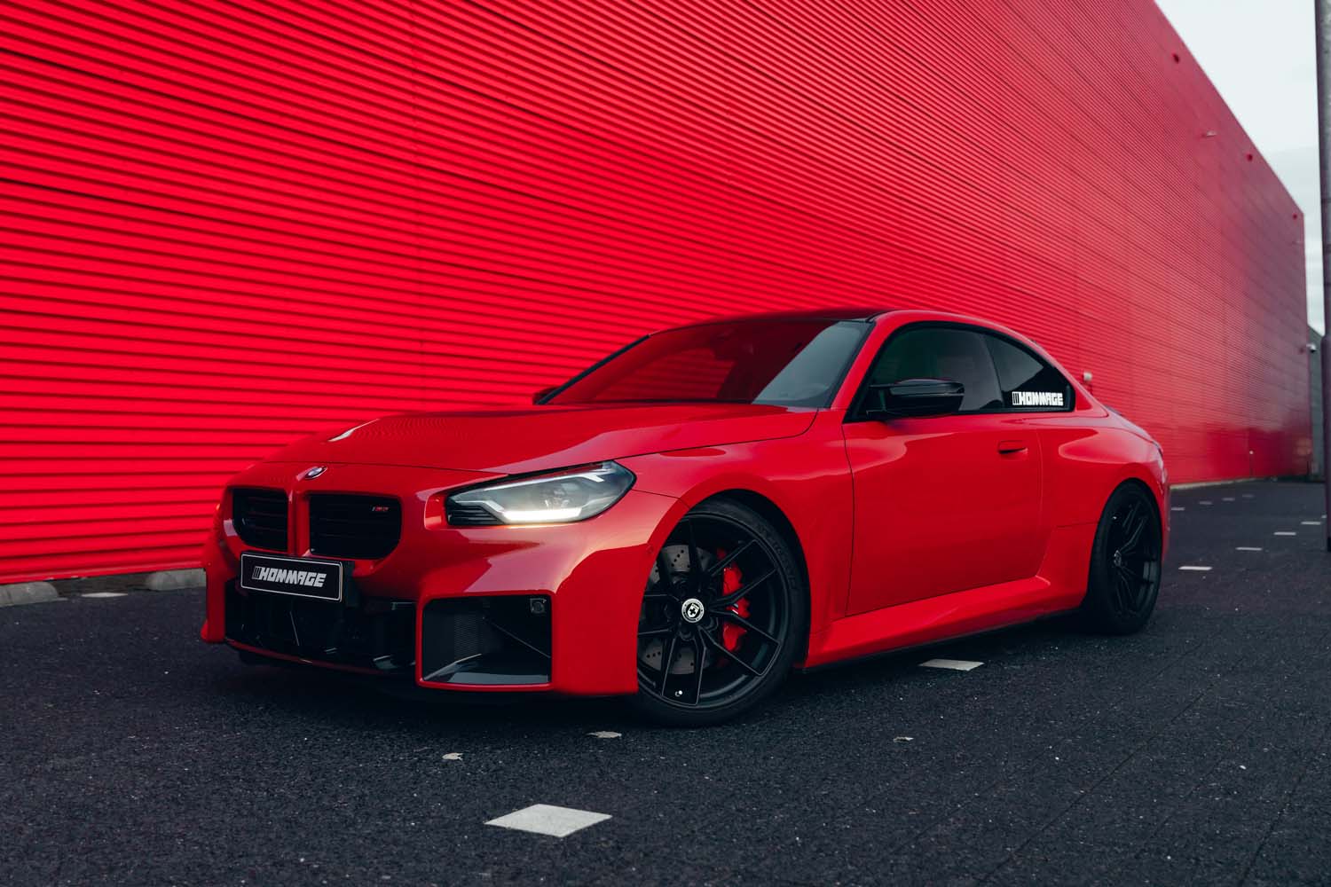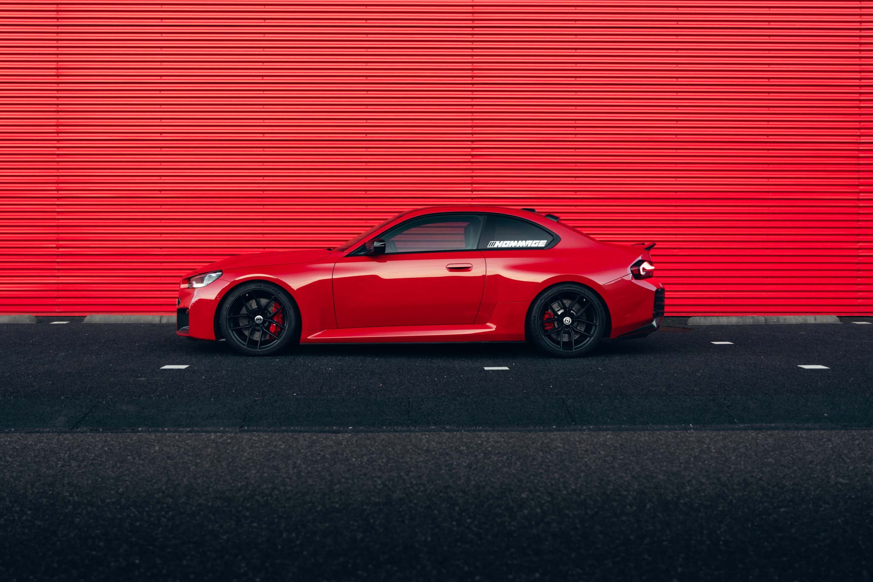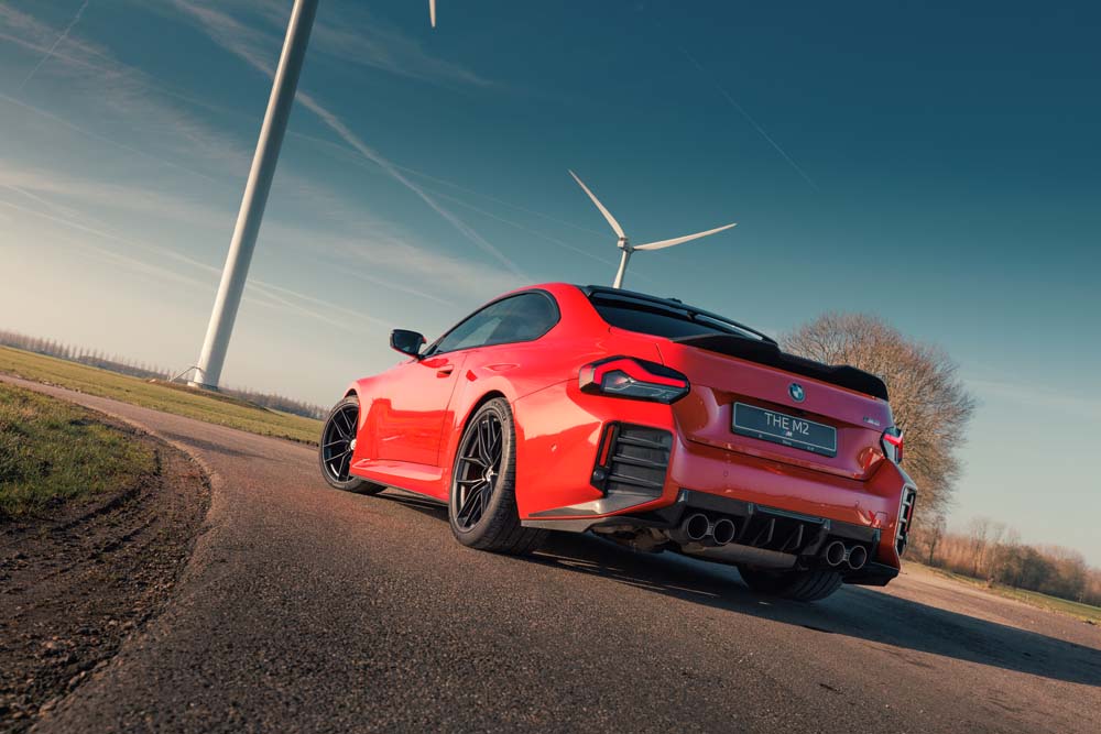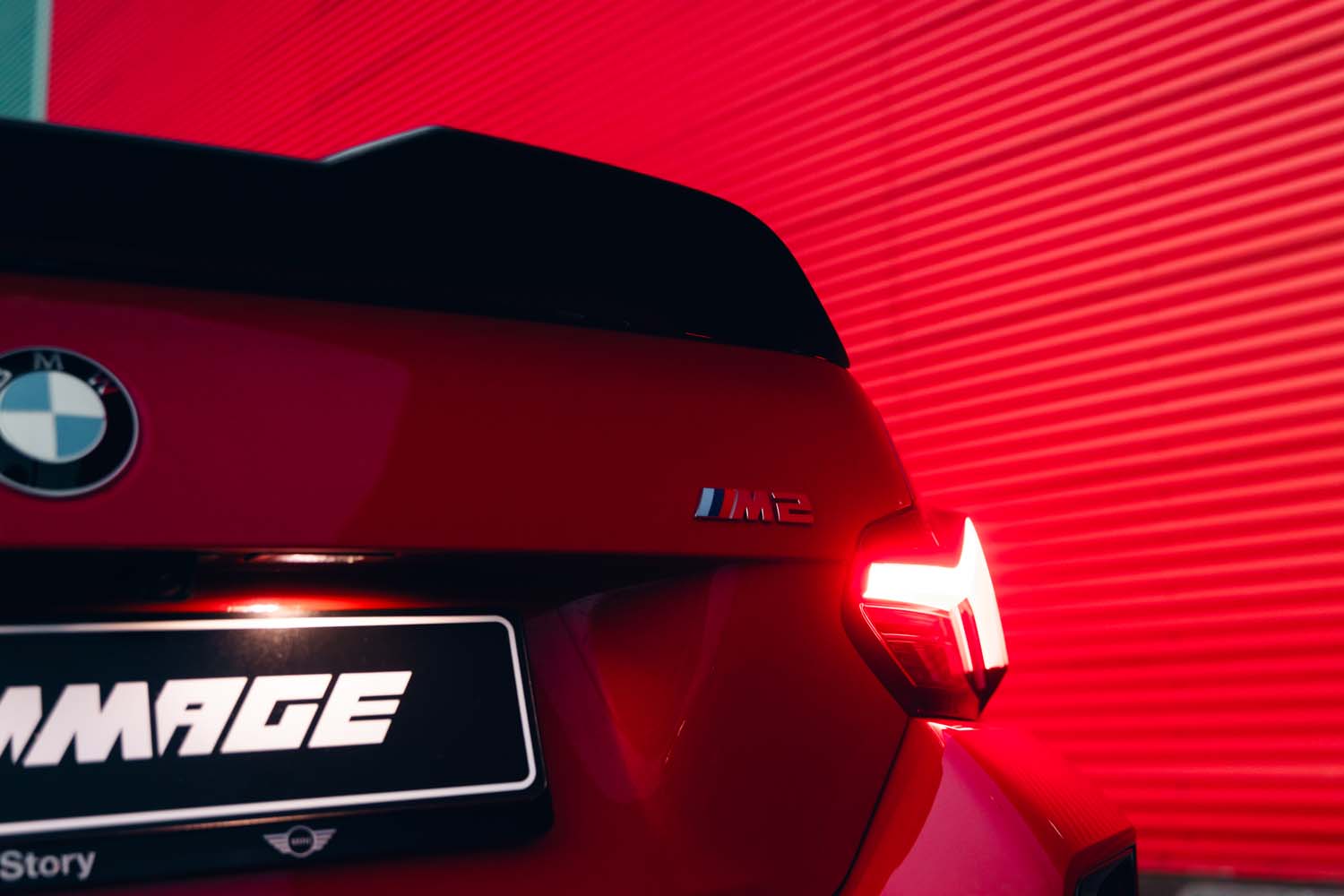 De side skirts geven de BMW M2 in Toronto Red een bredere en lagere uitstraling, alsof hij klaarstaat voor het circuit. Ze versterken het dynamische silhouet en sluiten naadloos aan op de lijnen van de carrosserie. Het gebruik van carbon onderstreept het sportieve karakter en vermindert tegelijkertijd het gewicht. Samen met de andere stylingdetails maken ze het plaatje compleet: strak, agressief en volledig in balans.